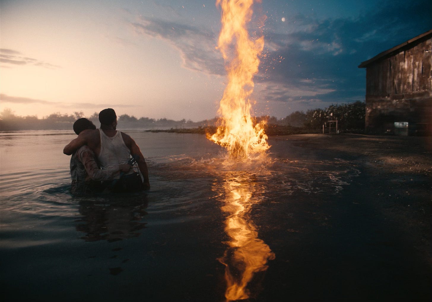 Ralla: We shot [one sequence] in an infinity pool that was right next to a natural pond, but the pond was filled with alligators, and they occasionally also came out. It needed to be extended all the way into the distance. So the guys at Storm put together a solver that you could actually tune to water, that would pick up the ripples on the water surface, and their CG simulation would look identical to that, and that could could just extend the ripples out all the way into the horizon. And then for the fire, we shot references [with practical fire effects] and then they tuned all their fire simulations until they matched that. They tuned their roof burn [in the 3 1/2 minutes shot] until it matched the Imax plant that played that we shot.